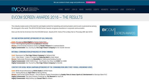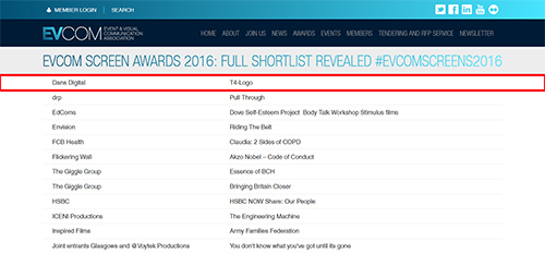 ▲Official Website of EVCOM announced that T4·Logo by Dans Digital won Gold Award in the Category VFX and Motion Graphics at EVCOM Screen Awards 2016