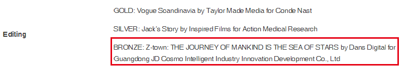 與此同時,點石數(shù)碼收到了來自EVCOM的喜訊。點石數(shù)碼為京東智谷制作的影視廣告宣傳片、CG動畫短片、企業(yè)宣傳片——《人類的征途是星辰大?!?,摘得“最佳動畫”、“最佳剪輯”兩項銅獎,成為了當場唯一獲獎的中國公司。